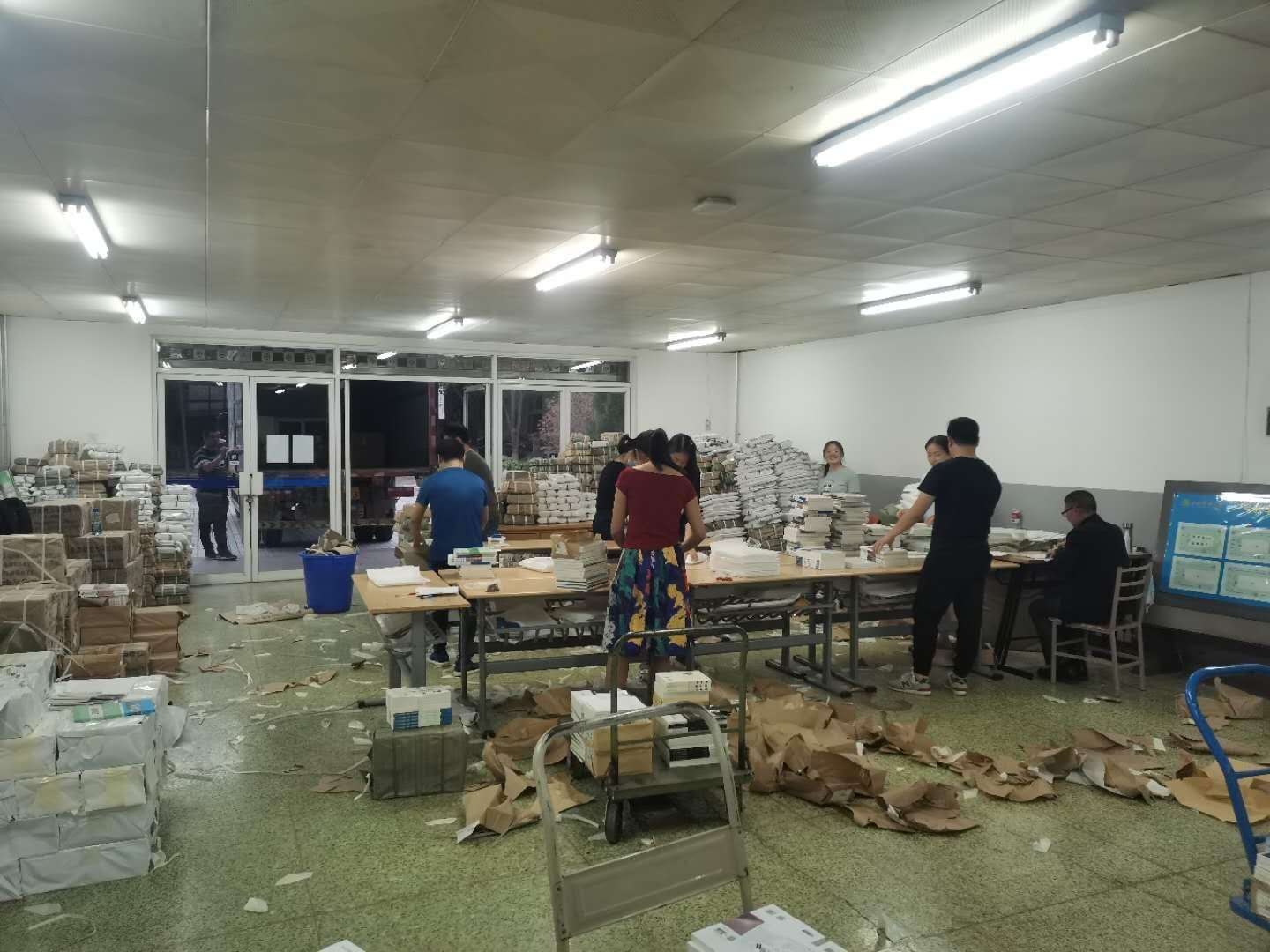在校領導的精心安排和周密部署下,本著“助力云端教學、保障學習效果”的理念,將60089冊教材如約打包發出。從學生信息收集到訂單核對、從教材拆封分揀到裝箱打包,5天時間,每天近20個小時的加班加點,最終成就了9896個訂單,將60089冊教材全部打包投遞。