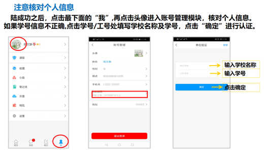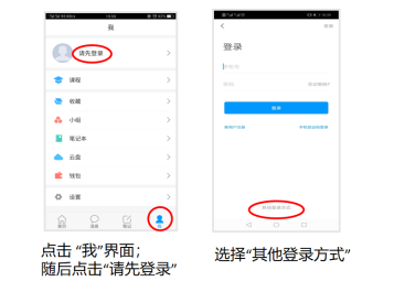 打開安裝好的學習通App,可以看到如下圖左的應用首頁,點擊右下角的“我的”,進入如下中圖的界面,點擊上方灰色頭像,選擇下方“其他登陸方式”輸入統一身份認證賬號及密碼登陸即可。