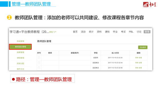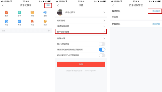手機端:進入一門課程——右上方“設置”——“教學團隊管理”——“添加教師”。