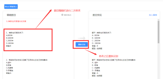 3)上傳成功后,在頁面左側編輯題目的區域可以進行編輯修改,如格式問題、空白行刪除等,編輯完成后點擊“重新識別”,系統會根據所編輯的內容進行識別調整。