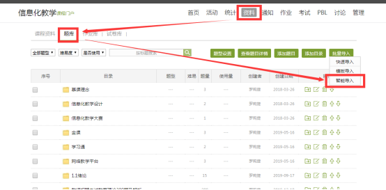 1)訪問學校平臺,賬號密碼登錄之后,進入課程資料區,選擇題庫-批量導入-智能導入。