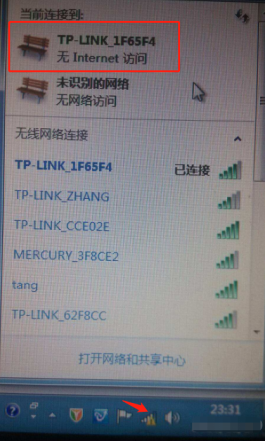 b) 無線網圖標出現黃色嘆號,并且可看到提示無Internet訪問,無線路由器配置丟失,請參考無線路由器配置手冊,重新配置IP地址等信息。
