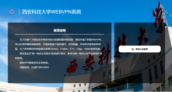 校外訪問地址:http://webvpn.xust.edu.cn(為了獲得更好的體驗建議使用Chrome、Firefox、IE11、Safari等瀏覽器)。